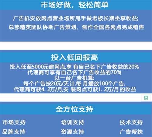 4.平臺其它廣告位的收益:若你承接的廣告投放至其它加盟者的廣告機上,你將擁有其廣告收益的20%。